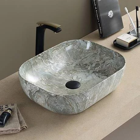 The eye catching luxury Arezzo gloss grey marble effect counter top basin has a stylish contemporary curved shape, perfect for creating a boutique feel in your bathroom. Designed to be mounted onto a worktop console and is best complemented with a high rise basin mixer or wall mounted tap. Manufactured from high quality vitreous china with a gloss grey marble effect finish. Some small dimensional variation may occur due to manufacturing tolerances. Waste not included.