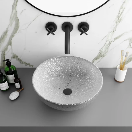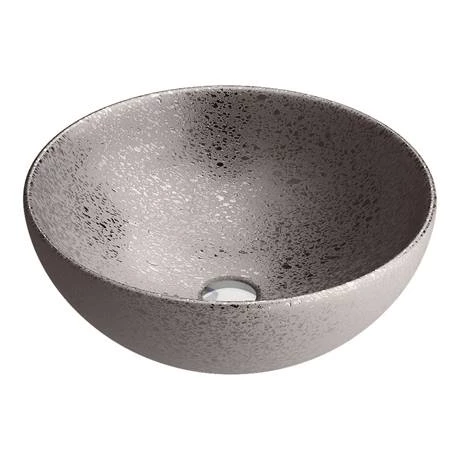 The modern curves of the Arezzo silver mottled design round counter top vessel basin will make a bold visual statement in any bathroom. Made from high quality vitreous china, the basin is perfect for counter tops and is best complemented with a high rise basin mixer or wall mounted tap. Some small dimensional variation may occur due to manufacturing tolerances. Waste not included.