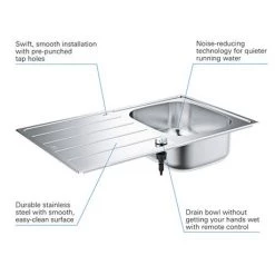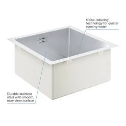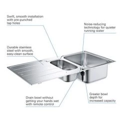With a modern design and stylish look, the K700 offers maximum usability. Made from 80% quartz / 20% acrylic resin and hardener composite material that will resist stains, scratches, heat and dents. GROHE Whisper technology gives the composite construction excellent noise-reduction qualities under running water. The GROHE QuickFix system makes installation quick and straightforward.Â