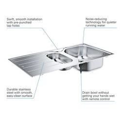 The stylish K700 is a versatile sink that can be undermounted or built-in. Made from 80% quartz / 20% acrylic resin and hardener composite material that will resist stains, scratches, heat and dents. GROHE Whisper technology gives the composite construction excellent noise-reduction qualities under running water. The GROHE QuickFix system makes installation quick and straightforward.Â